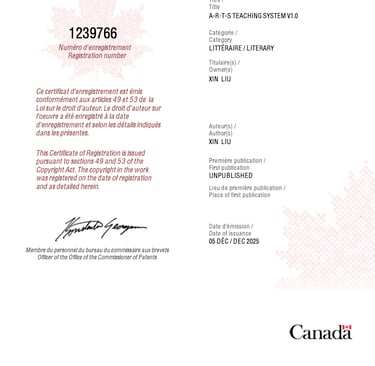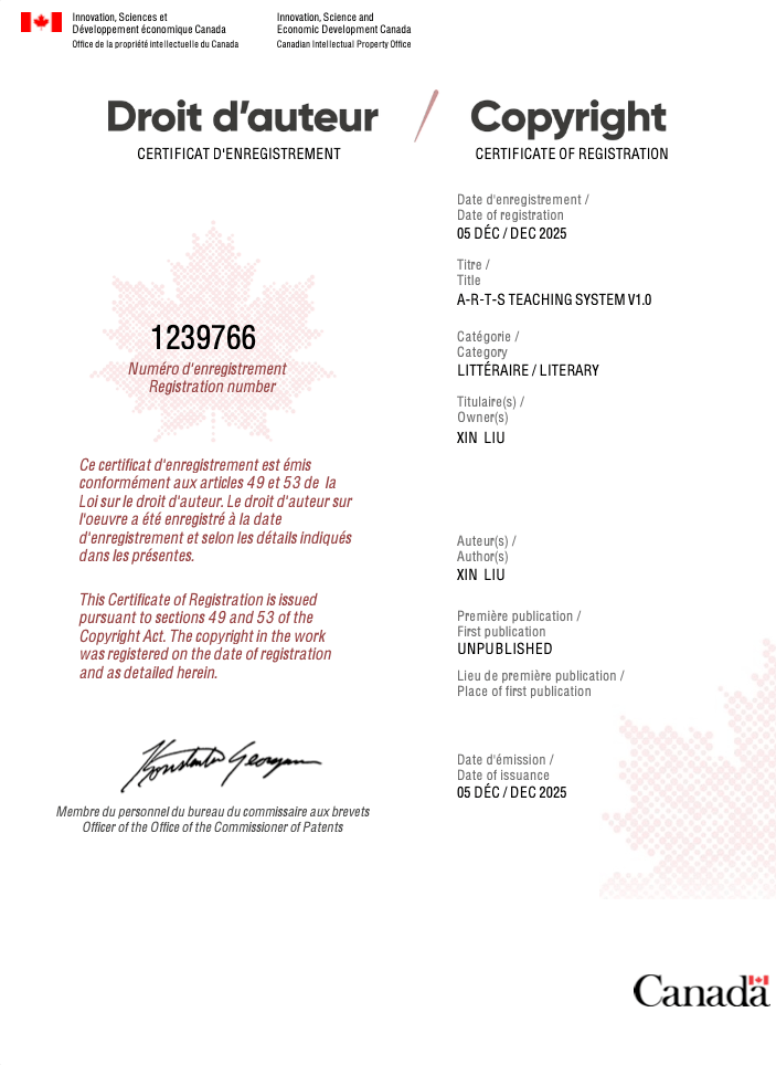 The A-R-T-S Teaching System v1.0 is an original educational framework developed by Xin Liu. All textual descriptions, structural models, terminology, and teaching processes in this document are protected under Canadian Copyright Law.